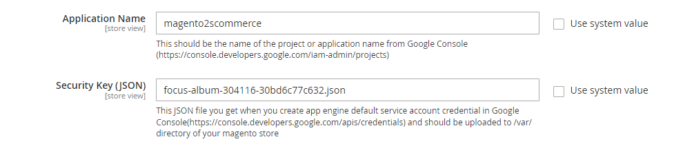 - Add the Application name and Security Key name that we obtained from the earlier steps while creating service account on Google Cloud Console. Make sure this key is placed in the var directory of your Magento installation.