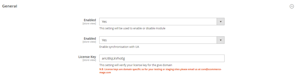 - Install the module and go to Stores>Configuration>Scommerce Configuration> Google Analytics Synchronization. Enable the module, add license key and enable the UA Synchronization to send missing transactions to Universal Analytics.
