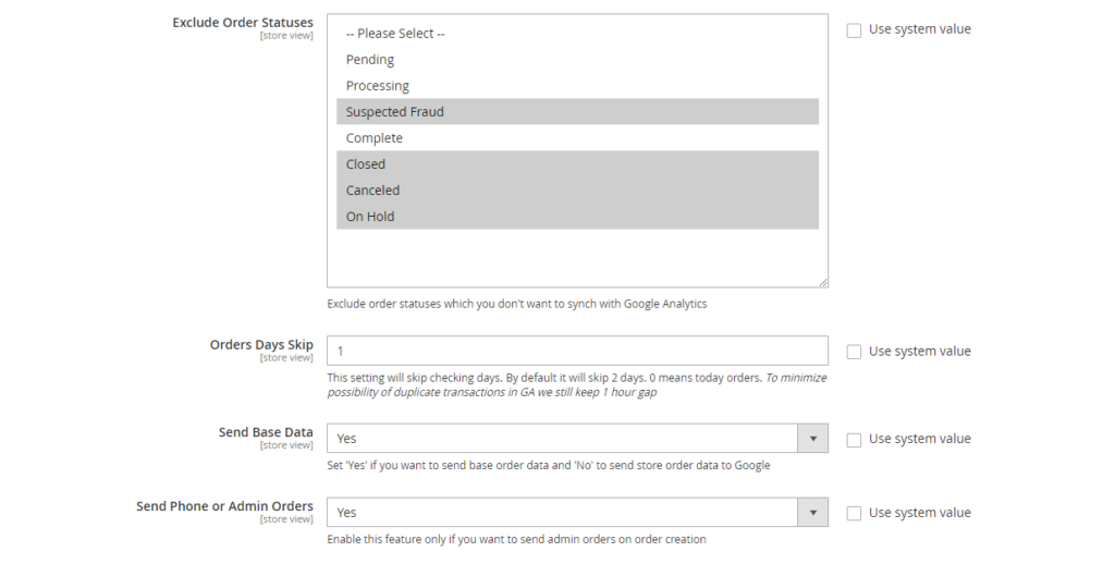 - You can choose to exclude certain order statues from being compared and synced. Set the “Order Days Skip to the number of days that you want to skip before syncing transactions for eg:- 1 means that all orders from yestarday will be compared and synced. You can also choose to compare send admin orders.