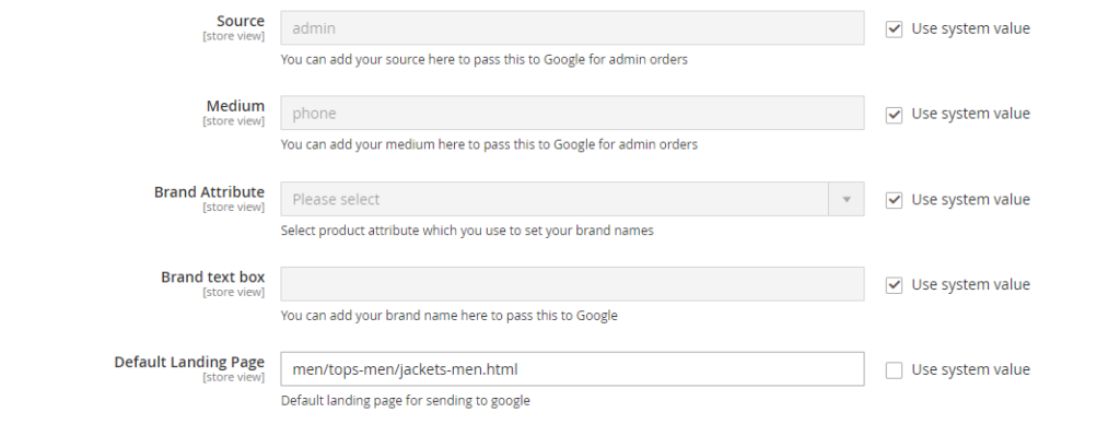 - Similarly you can choose to send specific source/medium with admin orders to Google. Add brand attribute, brand text and default landing page as well.
