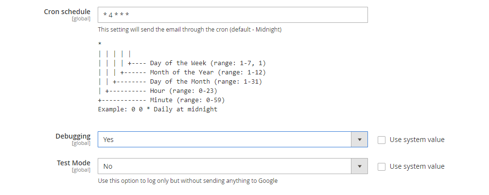 - Set the Cron job timings so that sync will automatically run during specific times of the day. Set ‘Debugging’ to ‘yes’, it will create sync log file in var/log which can be used to track which orders were synced with UA. Enabling “Test Mode” will not actually send transactions to UA but it is only for testing purposes.