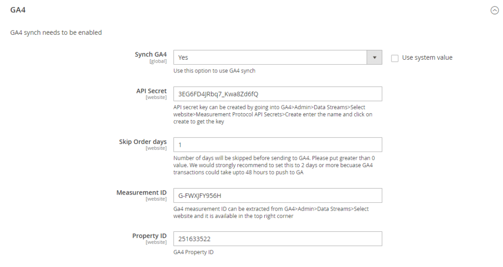 - Go to the GA4 section enable the sync, add Api secret key and measurement id obtained in the previous steps. Also, add the property id of your GA4 container and the order skip days(this can not be less than 1 as GA4 takes time to populate data into reports).