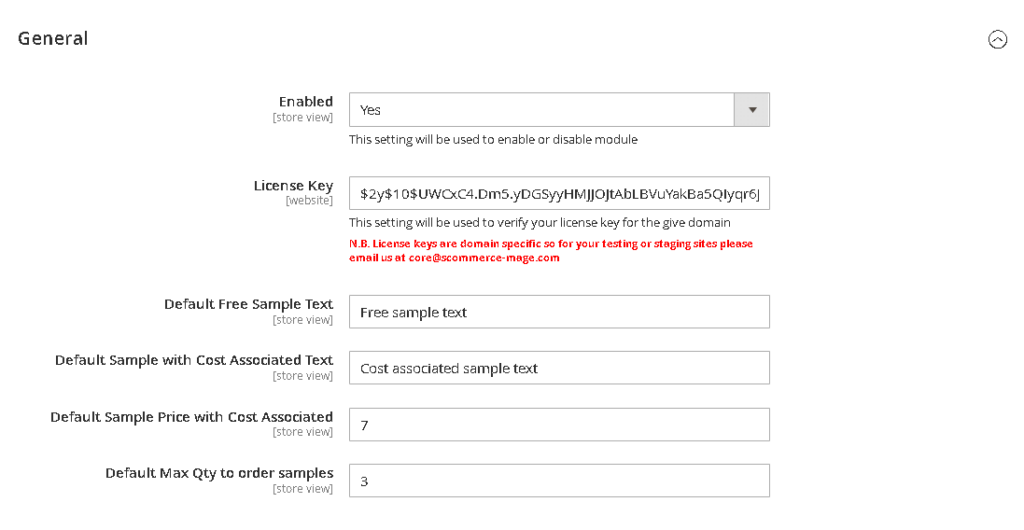 Admin > Stores > Configuration > Scommerce Configuration > Sample Product. - General Settings: Enable the module and enter your License Key (specific to your live/staging URL).