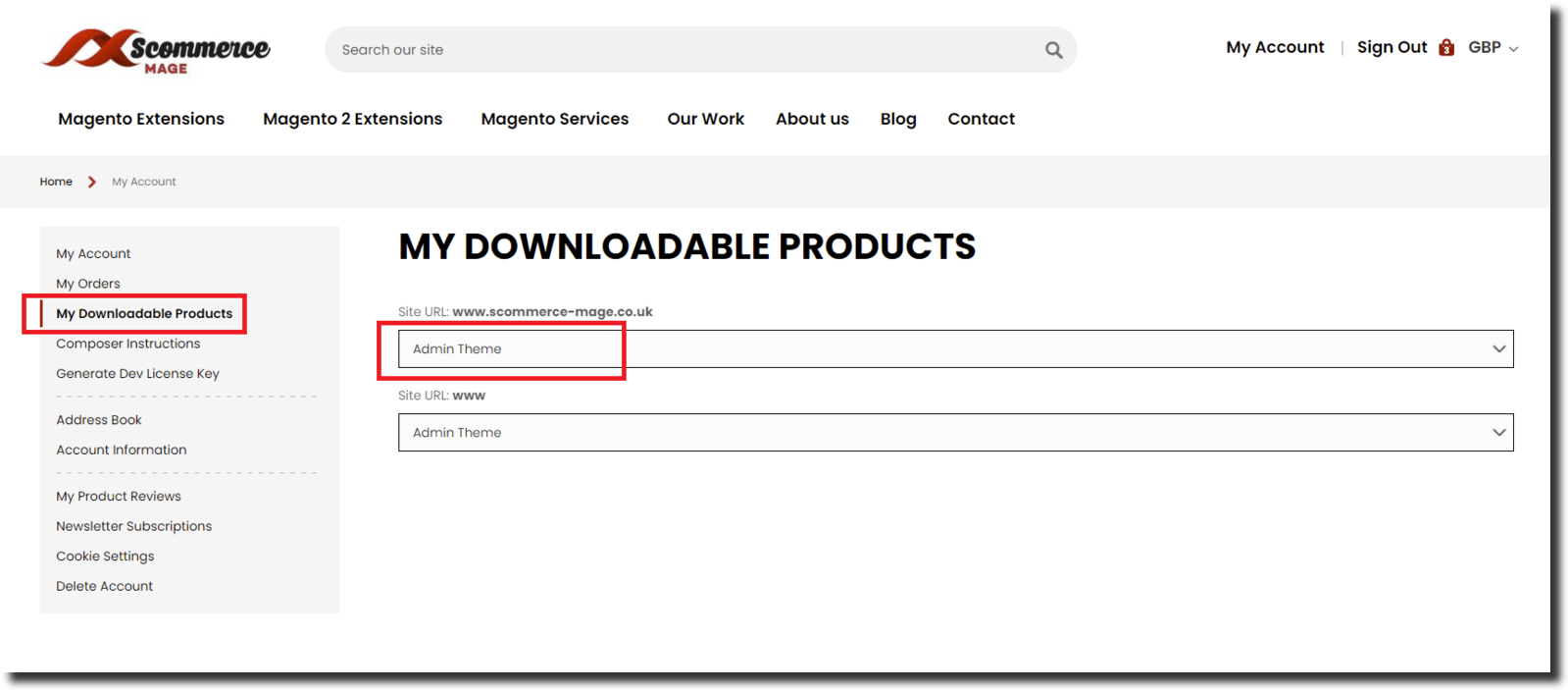 - Step 2:- Click on My Downloadable Products from the left menu.Now click on the extension that you want to purchase the upgrade for. A dropdown menu will appear.