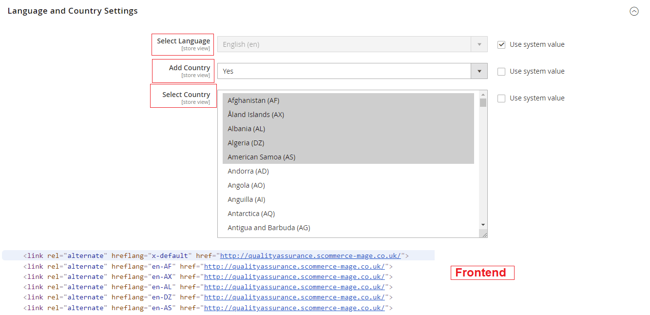 Our extension lets you choose specific languages and locales depending upon your requirements. Selected locales with the preferred language will be automatically added as Hreflang attribute tags. The extensions covers almost all major languages and a huge number of countries. To select specific counties or language go to Admin>Stores>Configuration>Scommerce configuration>Hreflang.You can select preferred language from the Select Language dropdown. Make sure to toggle Add Country to “yes” if you want to add various tags with different locales(countries). Please refer to the image below:-