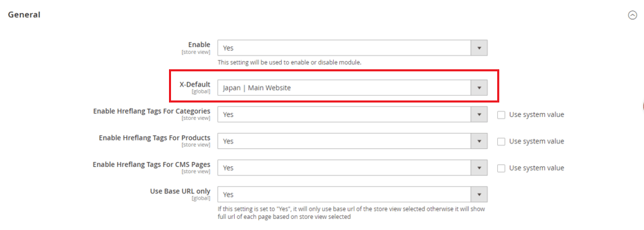 X-Default Hreflang attribute tells search engines that this page is not targeting any specific region/language. Our extension provides you a configuration by which you can set X-default for a particular store view. Navigate to Admin>Stores>Configuration>Scommerce Configuration>Hreflang. Click on the X-default option and choose the storeview you want to set as x-default from the dropdown menu.