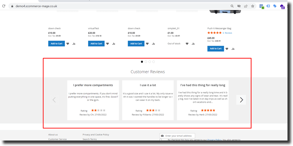 Magento 2 Product Reviews/Customer Reviews by Scommerce Mage gives you the ability to add Product review slider on category, homepage or any CMS pages. Create your own sliders with the reviews of your choosing. It also adds an email field in the product review form which is available at the product page.
