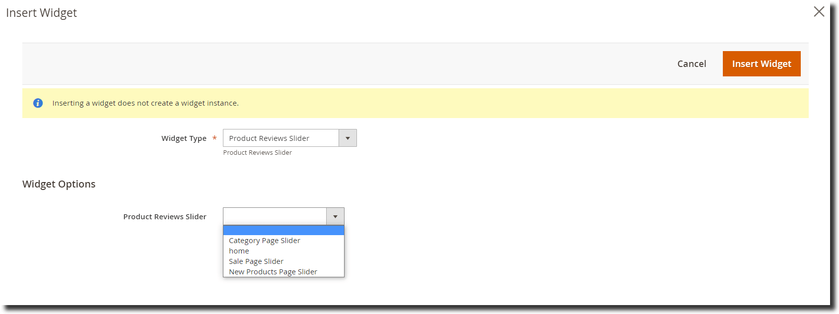 A widget is created for the product reviews slider. You can use this widget on pages or Blocks to display the Product/Customer Review slider. The widget has the dropdown option to select the slider that you want to display. The list would contain all the sliders that you have created from the Product Reviews Slider grid.